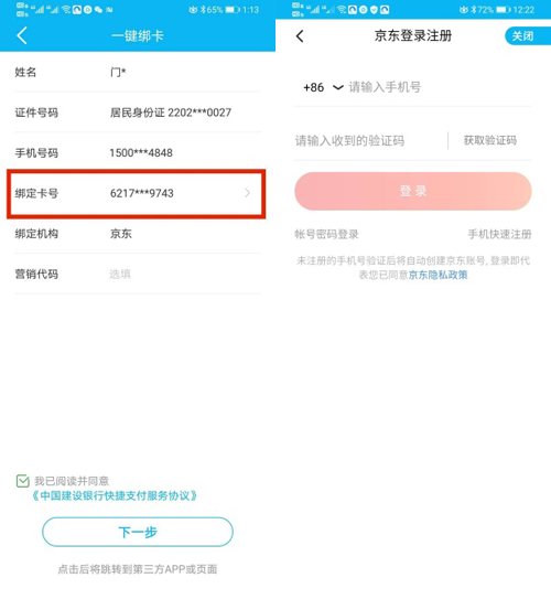 2.选择需要绑定的银行卡号,点击“下一步”。输入手机号码以及短信验证码,未注册的手机号验证后将自动创建京东账号。