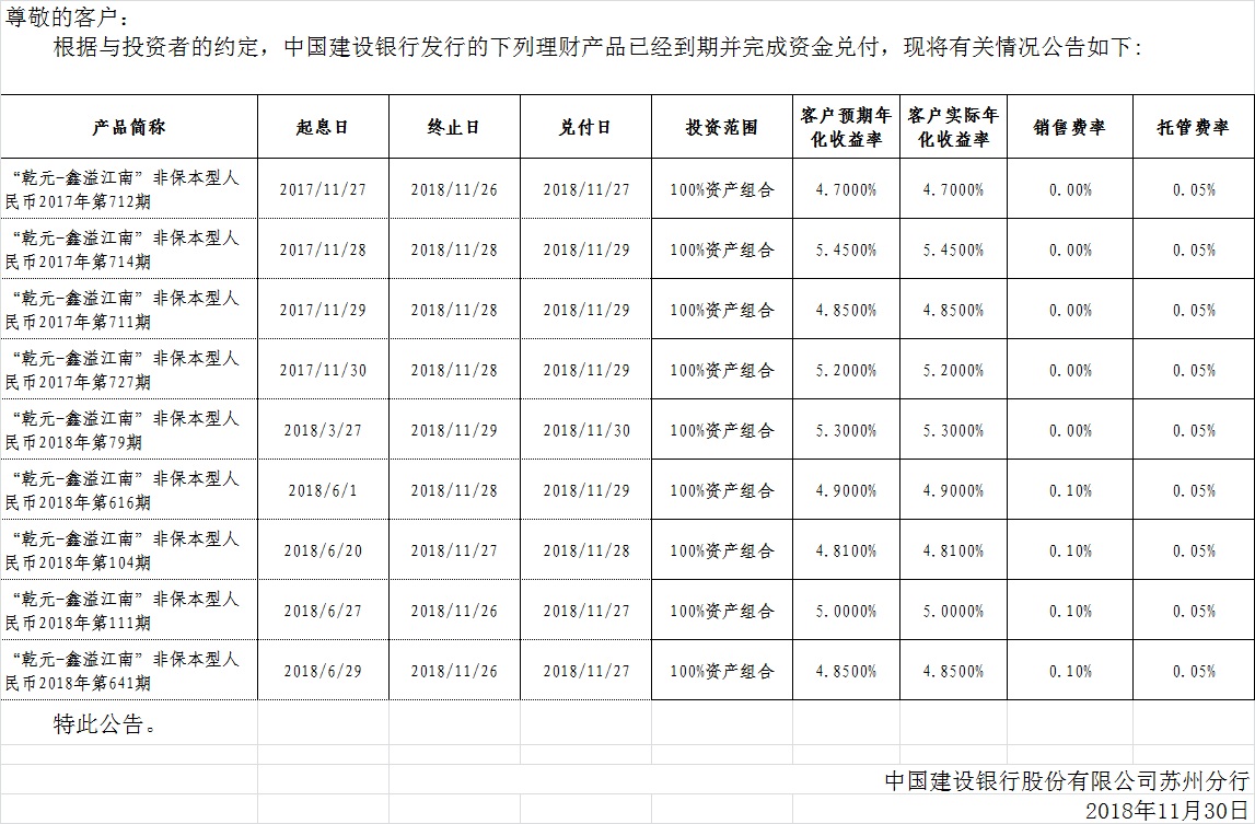中国建设银行理财产品终止及清算公告